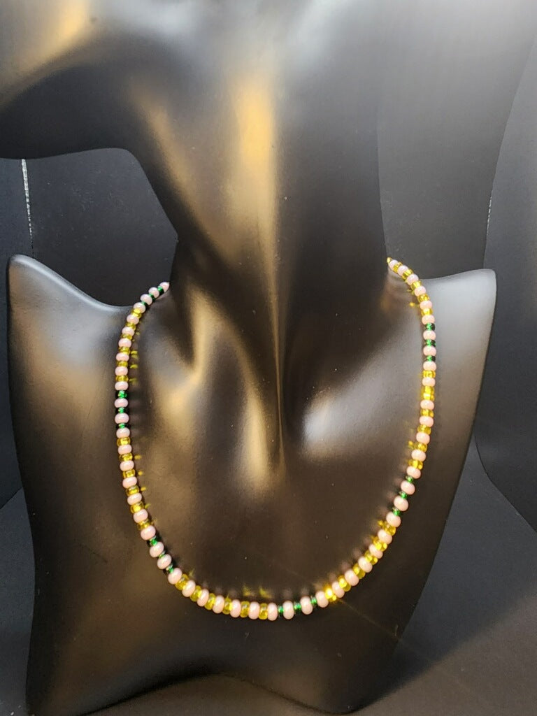Elevate your everyday look with this Pink Gold Life Necklace. The handcrafted bead surrounded by unique crystal colors of green, pink, and yellow is beaded on a sterling silver chain for a sophisticated and balanced design. Finished with a lobster clasp closure for a touch of elegance.