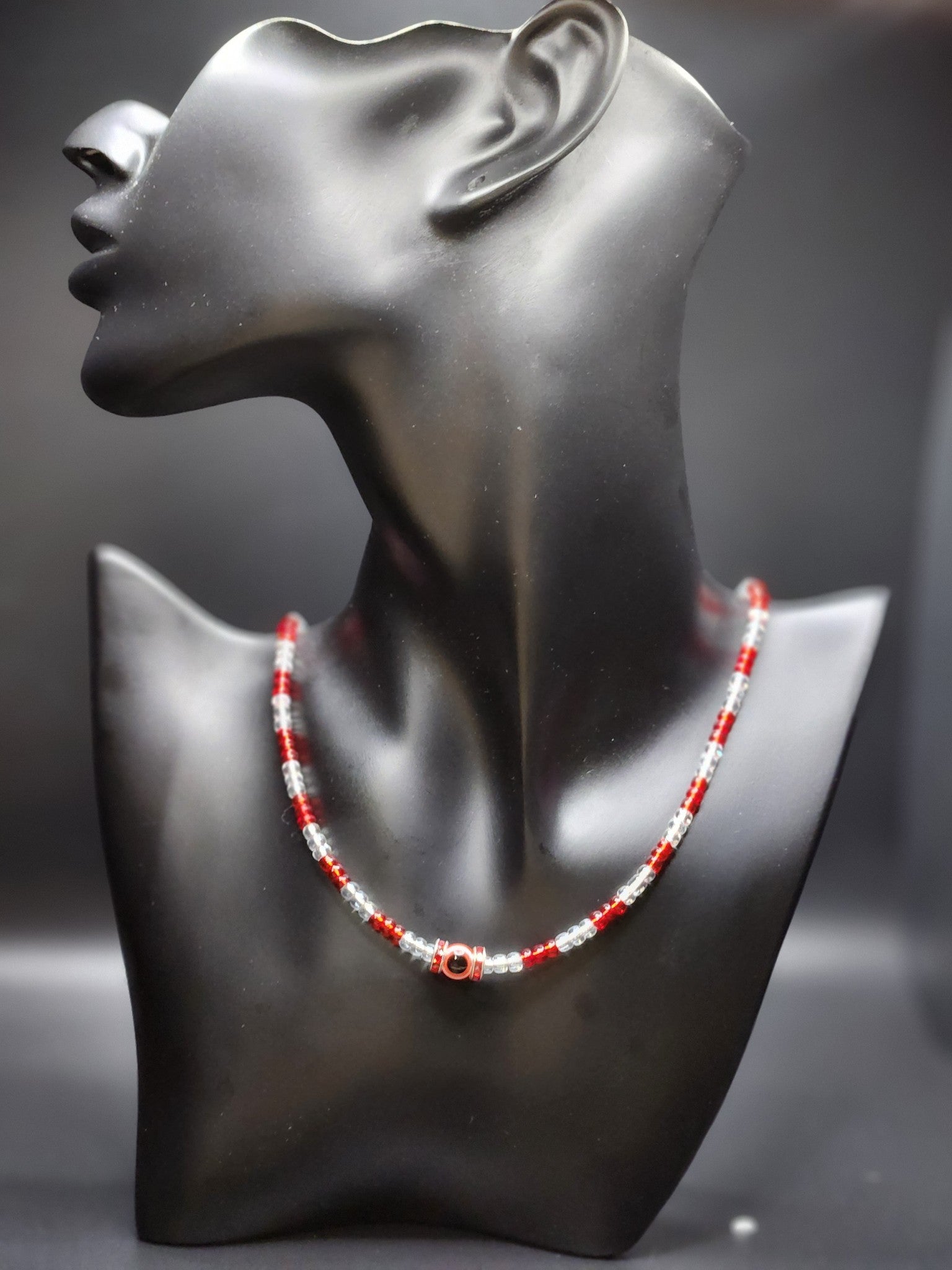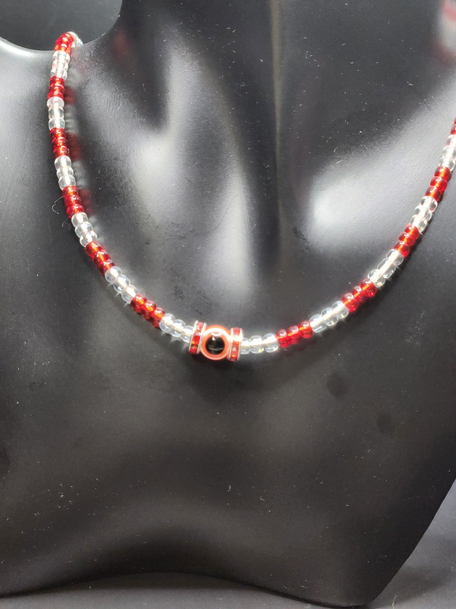 Red Protection Eye bead surrounded by spacer beads, uniquely designed with crystal colored beads of red and white stringed in unique pattern all beaded unto sterling silver chain, adorned with the lobster clasp closure to complete the design for the exquisite Red Eye Protector.